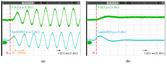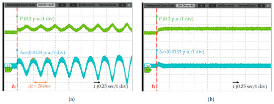 To verify the above eigenvalue analysis, real-time simulations are carried out, and the parameters are identical to those specified in Section 3. For each strategy, two testing points are examined. One is at the grid strength during an unstable state, while the other is at the adjusted SCR to restore the system stability. Figure 12, Figure 13 and Figure 14 demonstrate the active power output and frequency response of three control schemes following a disturbance at different SCRs. Simulation cases 1 and 2 are conducted to validate the stability analysis of the GFM converter (strategy #1), and the corresponding SCRs are 9.64 and 2.95, respectively. Additionally, as shown in Figure 12, the output power reference is changed from 0.9 p.u. to 1 p.u. at t1. In case 1, the active power output and frequency experience noticeable oscillations at the frequency of approximately 6.45 Hz, which is consistent with the analysis. After decreasing the grid strength to SCR = 2.95, the oscillations are damped, and the system reaches a new steady-state operating point in case 2, indicating that the GFM converter exhibits better stability when weakening the grid strength.