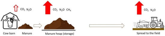The two most popular storage techniques are stacking in heaps and keeping manure in this form until application to the fields [26,27] and, much less frequently, composting in heaps. In the latter case, the manure is periodically turned and/or otherwise aerated [28,29]. According to the technique, composting introduces oxygen (O2) into the manure heaps, which usually contributes to the emission of gases produced under aerobic conditions, such as ammonia and carbon dioxide [26,30,31]. This is different in static heaps (no activities are performed on them), from which mostly gases characteristic of anaerobic conditions (i.e., methane) are produced [28,29].
