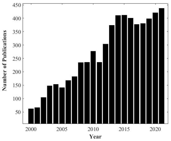 As biomass combustion is a complex process [], it is important to understand the physical and chemical processes involved at the particle level to enable proper understanding [,]. TGA is a powerful tool used to study the devolatilization rate during the biomass combustion process and obtain important parameters which are essential in characterizing and understanding its behavior [,]. TGA is widely implemented for investigating and comparing thermal degradation events and kinetics during the combustion of solid materials such as coal and biomass []. The decrease in mass is measured under controlled conditions while the thermal process is taking place, as the temperature increases with time. Consequently, information about the thermal conversion dependency on temperature will be obtained at the particle scale. According to the search results from the Web of Science Database using the keywords “thermogravimetric analysis” and “biomass”, there has been a growing trend around biomass and the application of TGA to biomass in scientific journals since 2000. Figure 2 presents the annual number of publications from 2000 to 2021, which highlights the use and importance of TGA to investigate the thermal decomposition of biomass.