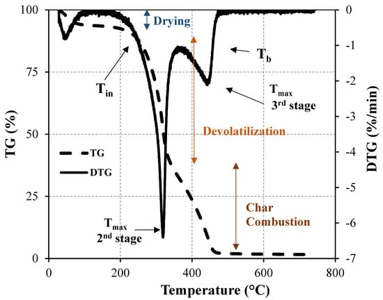 As represented in Figure 1, a comprehensive understanding of devolatilization is fundamental to the conversion process. In order to completely characterize this stage, the kinetics of the reaction and the determination of the volatiles released are essential. The study of biomass combustion behavior and the kinetics of the solid-state reactions have been developed through fundamental thermal analysis methods. According to the International Confederation for Thermal Analysis and Calorimetry (ICTAC), thermal analysis is referred to as a group of techniques where a property of the sample is monitored against time and/or temperature and, consequently, the change of the sample in terms of its weight is measured as a result of an imposed temperature profile in a specified atmosphere []. In previous work, thermogravimetric analysis (TGA) is the most common thermoanalytical technique used for solid-phase thermal degradation studies and for kinetic measurements [,], while analysis of the gaseous release process and the heat and mass transfer effects can be evaluated using the same technique but at a larger scale, which is commonly known as macro-TGA [].