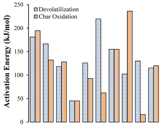 Hence, considering the current state-of-the-art in this subject, many factors can affect the kinetic parameters, including not only the process conditions, heterogeneity of the sample, heat and mass transfer limitations, and systematic errors, but also the processing and method for the analysis of the TGA results []. Consequently, a wide range of kinetic parameters has been reported in the literature and, therefore, direct comparisons are not possible. As evidence of this inconsistency, Figure 4 presents the different activation energy values reported in the literature for pine devolatilization and char oxidation. The set of results show a wide dispersion of data, which can be by a factor of up to five, depending on the author. This clearly shows that further experimentation should be carried out using TG analysis for the determination of the activation energy at each step of the biomass conversion.