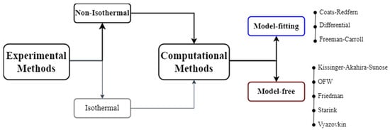 There are many isoconversional kinetic methods including Friedman (FR) [], Ozawa-Flynn-Wall (OFW) [,], Kissinger-Akahira-Sunose (KAS) [,,], Starink [], and Vyazovkin methods [,]. The corresponding equations and their advantages and disadvantages can be found in Table 4. In model fitting, different models such as the Coats-Redfern (CR) [], Freeman and Carroll [], Duvvuri et al. [], and differential models, can be fitted to the experimental data and whichever generates the best statistical fit is selected to evaluate the kinetic parameters. An overview of the biomass characterization process to obtain the kinetic parameters is represented in Figure 5.
