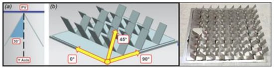 A fin heatsink covering more of the panel’s backside was developed by Hernandez-Perez et al. [28]. The authors investigated a multiangular segmented fin profile consisting of non-perforated Al-fins (see Figure 2). These were placed at alternating angles of ±30° to the vertical axis, with 20 mm gaps in between to allow for uniform airflow. The developed heatsink was compared against a conventional heatsink with linear fins at 90°, similar to Figure 1. A numerical analysis was first performed on both models using ANSYS Fluent, after which both heatsinks were experimentally tested on two 15 W Si-Poly panels in a Latin American climate.
