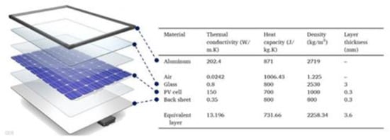 The different layers constituting the PV were also modelled as a single entity with a thickness of 3.6 mm. This was done to avoid any meshing issues related to contact regions and small edges. The models were then imported into the built-in CFD tool for simulation. The solid geometries were enclosed in computational domains that were sized with respect to panel length (0.635 m) based on the sizing approach outlined by Nazari and Eslami [7] in their CFD section. The fluid domain length was ninefold the length of the panels, with a third of this length being from the inlet to the panel. Meanwhile, domain height and width were both sevenfold the panel length. The panel was placed at an inclination angle of 24° and rotated such that the air from the velocity inlet would approach the fins at 45°. These orientations corresponded to the actual conditions under which the panel would be placed in the experimental setting. Additionally, the panel was placed at a height of 0.5 m above ground. The computational domain was assigned as air while the panel frame and heatsink fins were assigned as aluminium. Since it was modelled as a single element, a custom material was created for the equivalent layer, which consists of the PV cell, back sheet, and glass. The thermal and physical properties of this layer were also taken from Nazari and Eslami [7] and can be seen in Figure 3.