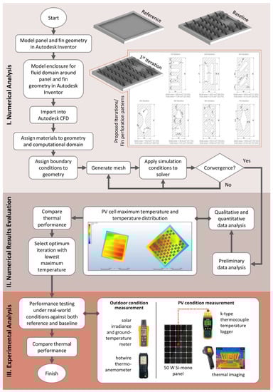 Figure 4 displays the schematic of the heatsink modelling and data-analysis process which was used to arrive at the optimal fin-perforation pattern. Following this, the boundary conditions were assigned to the air inlet, pressure outlet, and panel face. The air inlet was assigned a velocity of 2 m/s and a temperature of 28 °C while the pressure outlet was assigned a pressure value of 0 Pa. These boundary conditions were adopted from the numerical analysis carried out by Hernandez-Perez et al. [28]. To simulate the incoming irradiance, the panel was assigned a heat flux of 700 W/m2. Finally, the auto-sizing tool was used for mesh sizing and the steady-state CFD simulations were run until convergence for all the models under the following settings (Table 3).