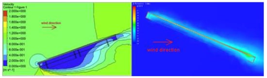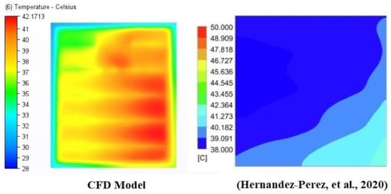 In order to assess the accuracy and reliability of the CFD simulations, the base model’s thermal distribution was compared to the CFD model from Hernandez-Perez et al. [28] (see Figure 5). The overall thermal distribution of the developed CFD model showed some degree of resemblance to the original model from the referenced study. Furthermore, the range of temperatures across the panels showed relatively close similarity, with the top-left corner being at roughly 38 °C and the bottom-left corner being at around 42 °C. It was determined through this validation process that the model was satisfactory.
