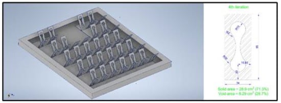 A visual comparison of the thermal distribution across the seven different iterations developed showed that the fourth iteration had a relatively more homogenous temperature distribution. This was supported by the fact that the fourth iteration (Figure 8) exhibited the lowest maximum temperature amongst all the other iterations (42.5 °C). Compared to the other fin designs, the fourth iteration had a higher-than-average cut-out area (28.7%), coming only second to the second iteration, which possessed the largest cut-out area out of all the developed designs (33.7%). Nevertheless, the maximum temperature for the second iteration was 0.6 °C higher than the fourth iteration. One of the possible reasons behind this could be the fourth iteration’s streamlined perforation design, though this is only speculative.