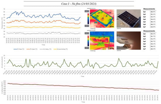 It was very clear that the panel with no fins had a much higher temperature compared to the panels with heatsinks attached. This was evident by the 11 °C difference in the average panel-face temperature, despite the no-fin panel being subjected to much less irradiance and ambient temperatures. This is congruent with the results obtained by Hernandez-Perez et al. [28], which showed 9.4 °C as a result of using the segmented fin heatsink. This reduction in temperature would correspond to an increase in panel efficiency by approximately 5%, given that panel efficiency decreases by 0.25–0.5% for every 1 °C increase in temperature above the STC. On the other hand, while the ground temperature was rather high, the extreme panel-face temperature cannot be attributed to it, as it would have been more reasonable for the average back-panel temperature to show this increase, as well since it is more exposed to the ground. Table 6 and Figure 10 displays the detailed air temperature, velocity, and irradiance patterns obtained for the different fin configurations.