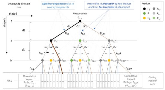 The dynamic programming result is the minimum cumulative impact at the optimization horizon, but the best replacement times are still unknown, even though the optimization result is an implicit consequence of them. Accordingly, the information of when to replace with which option, in other words, the definition of the optimal path in the decision tree, is still missing and, thus, also the lifespan of each individual product used. Which state the optimal path, , passes through at each stage, k, is obtained with forward calculation using Equation (13). The calculation thereby starts at stage 1, whereby minimum cumulative impacts, , at stage are known from the solved backward calculation (Equation (11)) this time. This result can then be used to calculate the impacts at each stage, , that lead to minimum cumulative impacts at the optimization horizon.