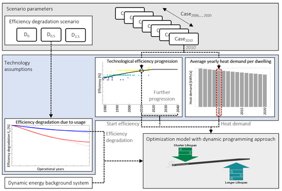 Model structure and baseline scenarios with exemplary illustration for (including a dynamic model of heat demand, technological efficiency progression defining the initial product efficiency and annually differentiated, varying electricity energy mixes) and efficiency degradation, .