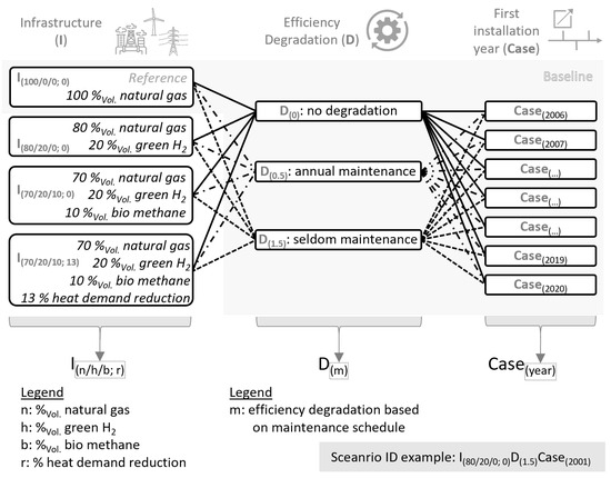 The OEL tends to be longer the smaller the impact intensities from the use phase become, which is why the impact of the use phase is reduced in extended scenario analysis for climate change impacts to better understand the results and to illustrate potential effects of an improved energy system. Biomethane and, especially, green power to hydrogen are repeatedly mentioned as important components on the road to a climate-neutral Germany [73]. However, biomethane is severely limited, for example, by the necessary land use required for food production, [74], and, therefore, has only lower importance as a characteristic transition technology for climate protection. The latter, on the other hand, is increasingly being discussed as an important lever in the course of the German hydrogen strategy [75]. Renewable energy (such as wind) is used to produce electricity for the electrolyzer to generate hydrogen, which is then injected into the natural gas pipeline and used as a mix in the heating boiler. Hydrogen in heating systems may have a high long-term potential and is currently technically limited to around in the gas mix by the boiler technology [76]. A changed gas mix with green power to hydrogen and biomethane as well as a reduced heat demand through improved insulation or better energy management is, therefore, assumed in an extended scenario analysis (see Supplementary Materials Section S3.3.7). Starting from the baseline scenario () from Section 3.1 (see Figure 4 for notation), the proportion of hydrogen and biomethane are first increased gradually in further scenarios (: green hydrogen, : with additional biomethane) and then heating further decarbonized with an additional reduced heat demand of (). These infrastructure scenarios are further combined with the efficiency degradation scenarios and cases for the initiation year, which are already used in the baseline scenarios (see scenario combination overview in Figure 4). The infrastructure scenarios remain constant per case, meaning that, for example, no gas mix switch is allowed within one scenario.