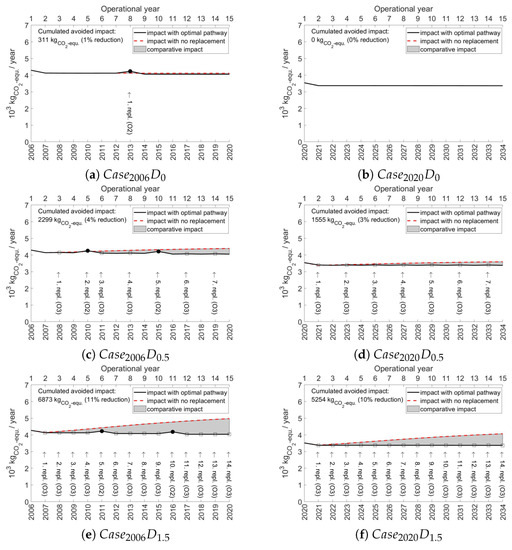 The climate change impact optimization results for two selected extreme cases are shown in Figure 5. Each diagram illustrates the annual impacts for a scenario where the original boiler is used for 15 years compared to the optimized annual impacts. The peaks on the graph, represented by unfilled squares for re-manufactured products and filled circles for new products, show the impacts of production and recycling at each point of product replacement. In the first case, a gas boiler was initially installed in 2006 (). This boiler reaches its design time in 2020. The results show that it should have been optimally replaced 1 (), 7 () or even 14 times (), depending on the maintenance schedule (Figure 5a,c,e). This means that the OEL would be between 1 () and 7 years () in this case. If the boiler is replaced in line with this schedule, the environmental impact is up to 11% smaller than in a scenario in which the boiler is used for 15 years; while a replacement is only proposed with a new product when neglecting efficiency degradation, a mix of replacements with re-manufactured (O3) and new products (O2) is recommended by the optimization approach in the cases with efficiency degradation. In this way, some efficiency gains in the cohort of products are exploited, and such improvements are retained by re-manufacturing the respective product. The latter only results in tiny peaks in Figure 5 since impacts due to the re-manufacturing process are minor. The higher the efficiency degradation is, the more frequently re-manufacturing is recommended, even if more efficient products are available in the future. In contrast, if a boiler is installed for the first time in 2020 (), solely efficiency degradation influences the optimized replacement scheme, resulting in replacements with re-manufactured products every two years () or every year () as the OEL (Figure 5b,d,f). In this case, replacement with new products is of less advantage because the technology is already mature [64].
