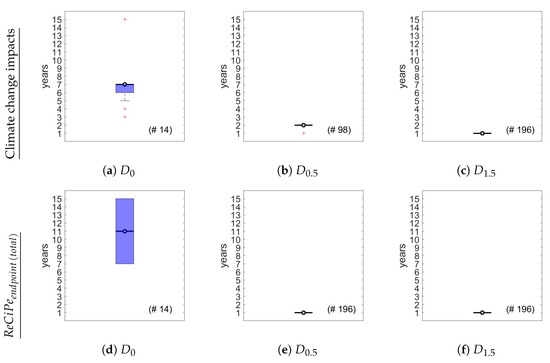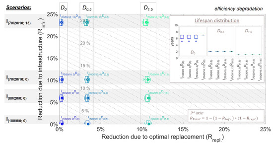 The OEL results show that the proportion of resulting impacts from the production phase to the use phase is decisive. This is the reason why results for climate change impacts and as well as costs vary considerably. The latter is also influenced by the discounting assumed. The results of the extended scenario analysis for climate change impacts are shown in Figure 7. It shows the reduction potential compared to normal usage with no replacement over 15 years and no improvement in the infrastructure. Each Tukey boxplot represents the reduction potential per evaluated scenario (, see Figure 4 for a scenario overview) of all 15 cases considered (: to ) with the respective maintenance plan. The assumed impact reduction potential due to improved infrastructure is arranged along the y-axis (, , and ) and the maintenance scenarios (, and ) are organized along the x-axis. The results from the baseline assessment can be found on the x-axis (). The climate change impact reduction potential of an optimized replacement schedule () decreases only a little with an improved infrastructure per maintenance scenario. It also has only little effect on the optimal lifespan. The scenario analysis shows accordingly that changed impacts from production due to different material composition and weight or different selected system boundaries for EoL would not drastically change the results. This could be of significance for other products, especially where a scaling relationship matters [71]. Similarly, system boundaries and methodological choices in LCA, e.g., the allocation method, could influence results there [79] as smaller impacts from production and EoL favor early replacement and vice versa.