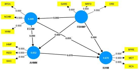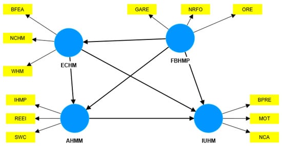 Figure 1 presents four latent variables (ECHM, AHMM, IUHM and FBHMP), and the indicators contain the research results, evaluated through a 5-point Likert scale (from 1—Total disagreement to 5—Total agreement).