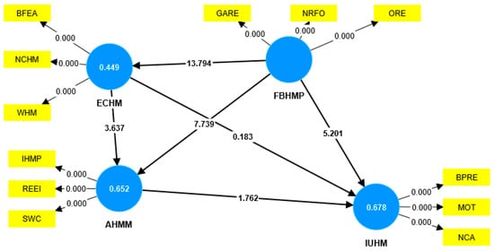 The variables FBHMP and ECHM explain 65.2% of the variance of the endogenous variable AHMM (coefficient of determination R2 = 0.652), and the variable FBHMP explains 44.9% of the variance of the endogenous variable ECHM (coefficient of determination R2 = 0.449).
