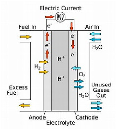 A fuel cell is an energy conversion device that generates electricity through an electrochemical reaction. It is considered reliable compared with a traditional combustion engine, with the advantage of high efficiency and being pollution-free. It is not a new concept; it was originally discovered in 1839 [18]. In 1960, the primary hydrogen fuel cell vehicle was developed, and the National Aeronautics and Space Administration (NASA) utilized fuel cells for both Apollo and the space shuttle [19]. Most fuel cells are in various development stages. The most commonly used are Alkaline Fuel Cell (AFC), Solid Oxide Fuel Cell (SOFC), Polymer Electrolyte Fuel Cell (PEFC), Phosphoric Acid Fuel Cell (PAFC), and Molten Carbonate Fuel Cell (MCFC). A fuel cell is made up of two electrodes, an anode, and a cathode sandwiched together with an electrolyte layer. Figure 1 shows a diagram of a fuel cell with a reaction of gases and the flow of ions through the cell. Fuel is continuously supplied to the anode side, and oxygen is drawn from outside through the cathode. Typically, a single fuel cell produces 1V of electricity or less. To produce more electricity, stacked fuel cells are realized by connecting them in series. The term “fuel cell” refers to both a stack and individual cells under the fuel cell umbrella. Depending on the application, it may require a few cells or up to a hundred cells stacked together to achieve the required output power. The versatility of fuel cells makes them ideal for a wide array of applications.
