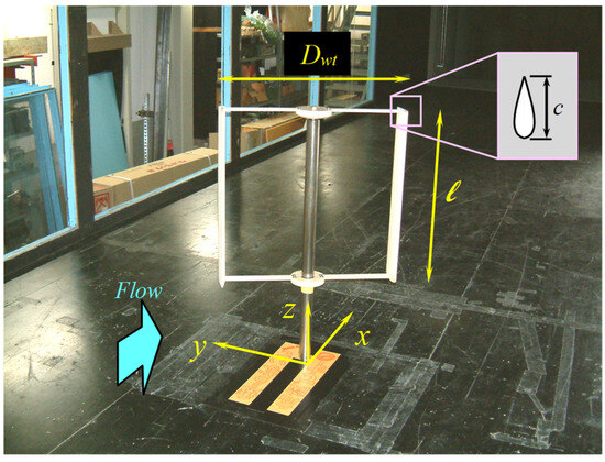 The wind tunnel used for the experiments was a large boundary layer wind tunnel at the Research Institute for Applied Mechanics of Kyushu University with a measurement section that was 3.6 m wide × 2 m high × 15 m long and a maximum wind speed of 30 m/s. The experimental wind speed U0 was set to U0 = 9 m/s for the power performance experiment and U0 = 1 m/s for the flow visualization experiment. During the experiments, the ceiling and both side walls were opened for a length of 6 m in the main flow direction to prevent the wind turbine and surrounding additions from blocking the flow. An ultrasonic anemometer was installed 3 m upstream of the semi-open measurement section to detect the approaching wind velocity (see Figure 1). The position of the ultrasonic anemometer in the width direction was set at 0.5 m from the wall in order to avoid the influence of the boundary layer of the wind tunnel wall and to avoid the influence of the wake on the wind turbine installed in the center of the wind tunnel measurement section. The distance between the ultrasonic anemometer and the wind tunnel floor was 0.75 m. The wind speed detected by the ultrasonic anemometer was measured simultaneously with the wind turbine output and averaged over 30 s. The wind turbine used in the experiment was made of wood (both the blade and the support arm), and the blade length l and the rotating diameter Dwt were both 0.7 m (see Figure 2). The Reynolds number for the output performance test was 4.2 × 105 when the diameter of the wind turbine was taken as the representative length. As shown in the photo, the wind turbine was a two-bladed straight blade type, and the symmetric blade type NACA0024 was used. The solidity of the wind turbine was σ = 0.14. The chord length of the blade was set to c = 0.15 m. Dwt/Tw = 0.19, where Tw is the width of the wind tunnel measurement area. The wind turbine was installed so that the lower edge of the blade was at a height of z = 0.35 m above the floor when the coordinate system was defined as shown in Figure 2. In the output performance experiment, a non-contact torque meter (rated at 0.5 N·m) was connected to the wind turbine, and the torque Q (N·m) and rotational speed n (1/s) of the wind turbine were measured when the load was gradually applied from no load, and the output P (W) = Q·2πn was calculated to obtain the output performance curve. The accuracy of the torque meter was ± 0.2 %F. S, which was equivalent to about ±1% of the torque to be measured. The specifications of the equipment are shown in Table 1. The smoke wire method was used to visualize the flow. The visualization cross-section was positioned at the center of the wind turbine blade span (z = 0.7 m), and the rotational speed of the wind turbine was adjusted to the tip speed ratio, where the power output was maximized.