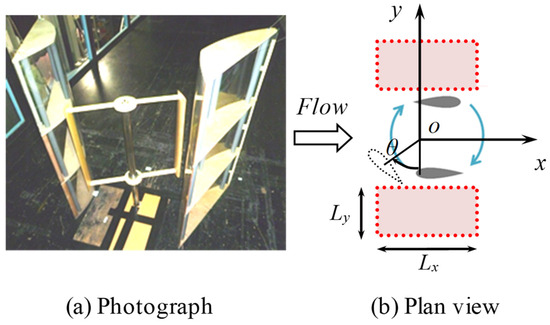 There were several previous attempts to install peripheral structures on vertical-axis wind turbines. Shahizare et al. [6] and Li et al. [7] considered structures that did not affect the characteristics of vertical-axis wind turbines, which were non-directional to the wind direction. On the other hand, due to the asymmetry of the rotor, there were attempts to reduce negative torque by installing a deflector upstream of a drag-type vertical-axis wind turbine [8,9]. Recently, applications of a deflector to a lift-type wind turbine were examined [10,11]. In those cases, the deflector was also intended to control the angle of attack into the blades. Deflectors were applied to a pair of wind turbines as well [12,13,14]. In these approaches, a single deflector was intended to have a positive impact on two wind turbines.