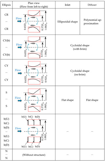 Wind-acceleration structures with the same cross-section in the vertical direction were installed around the wind turbine as shown in Figure 3a. In this experiment, the area where the structures were placed was predetermined to be inside Lx and Ly, shown in Figure 3b, and by comparing the power output against the wind energy using the limited area, we searched for a shape that could increase the power output more effectively. Specifically, we installed structures with curved (or flat) shapes as shown in Figure 4. The range of Lx and Ly in Figure 3b was set as shown in Equations (1) and (2). This range was set according to the diffuser structure designed and fabricated by Takahashi [5]. Figure 4 shows the abbreviations and shapes of the structures. The shape of the structures will henceforth be denoted as “(abbreviation for a surface placed in a region where y is positive)-(abbreviation for a surface placed in a region where y is negative)”. CY(b) is a brimmed cycloid shape [2], which has been applied to horizontal-axis wind turbines to obtain a high power increase. CY is a cycloid shape without a brim to investigate the effect of the brim. CR is an elliptically shaped curved surface so that the diffuser opening is larger than that of CY. S is the shape where the inlet, throat, and outlet of the CR are connected by a plane in order to investigate the effect of a curved shape. b(U), b(C), and b(D) are flat-plate shapes with only a brim, in contrast to CY. For the Venturi-shaped structures, the throat position was set at x = 0 since past studies have shown that aligning the throat with the center of the wind turbine is effective [5]. The most effective installation position of the flat plate was also investigated by changing the installation position in the x-direction: upstream, center, and downstream of the wind turbine. For detailed shape data of each surface shape, please refer to reference [15]. The throat width in the y-direction was set to keep the structures and the wind turbine as close as possible, with only a small gap to avoid contact. For the Venturi-shaped structure, the minimum gap between the wind turbine and the structure at the throat was 0.03 m.