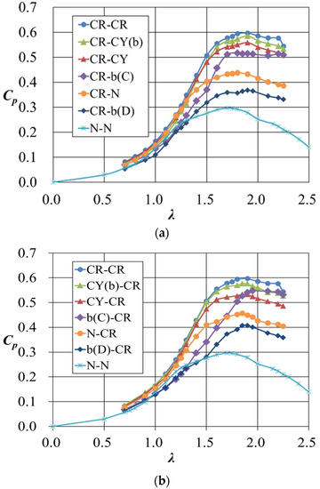 Power coefficient Cp of wind turbines vs. tip speed ratio λ (CR type used with other shapes). (a) The shape of the structure in the positive y region was fixed to CR. (b) The shape of the structure in the negative y region was fixed to CR.