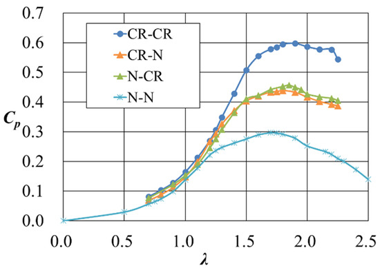Power coefficient Cp of wind turbines vs. tip speed ratio λ (CR-type structures).