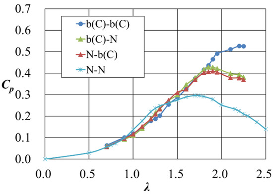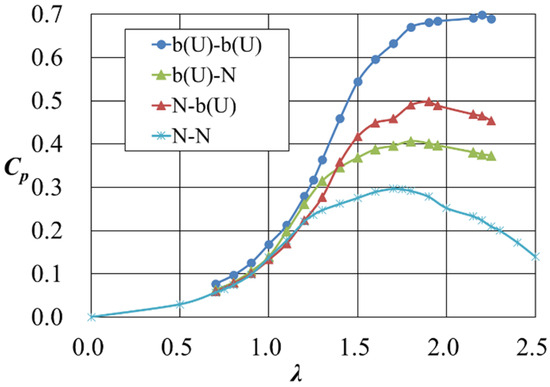 Next, one side of the symmetrical structure was removed, and the effect of the power increase on each side was investigated. Figure 8, Figure 9 and Figure 10 show the power curves for the case where the structure was installed only on one side, together with the power curves for the case where the structure was installed on both sides. In the case of the Venturi-shaped CR (Figure 8), the same power increase effect was obtained regardless of whether the additive was installed on the positive or negative side of y (“CR-N” and “N-CR”), and there was no significant difference in the power curves. The increase in power when the additive was installed only on one side was about half of that when it was installed on both sides, and the total increase on one side was almost equal to that on both sides. In the case of b(C) (Figure 9), where the flat plate was aligned with the center of the wind turbine, the same results were obtained, but in the region where λ ≤ 1.8, the power increase on only one side was equal to that on both sides. On the other hand, in the case of the b(U) geometry, where the flat plate was placed upstream of the wind turbine (Figure 10), depending on whether the additive was placed in the positive or negative region of y (“b(U)-N” or “N-b(U)”), there was a large difference in the power curves, with a larger increase in power when the additive was placed in the negative y region. In addition, it was found that the increase in power output when the additive was placed on both sides was larger than the sum of the increases when the additive was placed on one side.