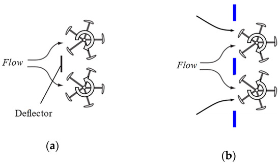 The effect of placing a flat plate upstream of the side where the blades of a vertical-axis wind turbine are subjected to dragging forces has also been shown by Kim et al. [12]. They showed that the power output of a five-bladed wind turbine can be increased by a factor of three by placing two vertical-axis wind turbines rotating in opposite directions in a row, as shown in Figure 16a, and installing a deflector upstream of the side where the blades encounter drag. However, in our experiment, it was found that the power increase effect was higher when the additions were installed on both sides of the wind turbine. So we propose installing the additions on both sides, as shown in Figure 16b. It is known from previous studies [5] that the power increase caused by the wind-acceleration structure can be obtained in the same way even if the number of blades of the wind turbine is changed. Therefore, the installation of flat plates on both sides of the wind turbine should increase the wind collection and acceleration effect more than the installation on a single side, and together with the blade drag reduction effect caused by the flat plate installed upstream, an even higher power increase can be obtained.