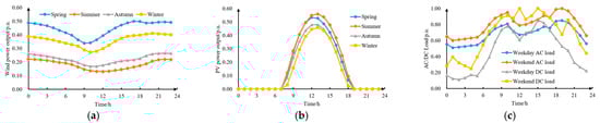 (a) Wind power output of typical weather throughout the year; (b) PV power output of typical weather throughout the year; (c) AC/DC load demand of expressway microgrid.