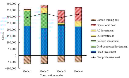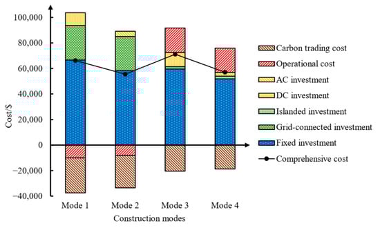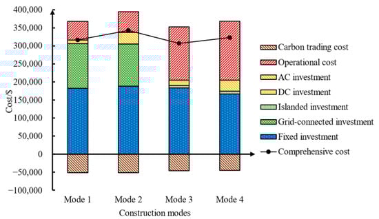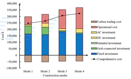 The construction mode in this scenario is mode 1, and the comprehensive cost is USD 246,838. The results of the capacity configuration and annualized comprehensive cost of the expressway microgrid under different construction modes are shown in Table 3 and Figure 4.