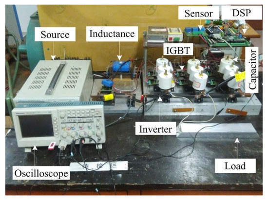 An experimental prototype of a single-phase CSI is established and shown in Figure 10. The corresponding soft simulation is presented in the Supplementary Material. The algorithm of modulation and control are implemented by TMS320F28335, and the IGBT and diode are PM400HSA120 and RM300HA-24F, respectively. udc is supplied by a DC power supply. The parameters of the passive components are consistent with Table 4.