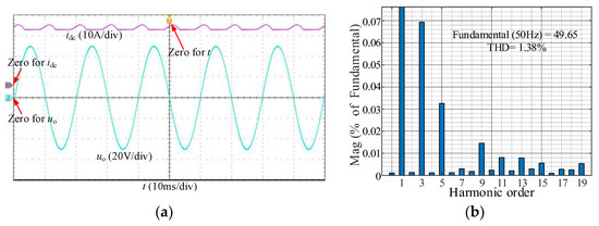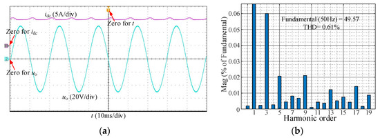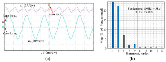 The amplitude and frequency of the reference of uo are 50 V and 50 Hz. i dc * is set to 13.5 A. The experimental waveforms of idc and uo are shown in Figure 11a, where the amplitude and frequency of uo are consistent with the reference, and idc is maintained in the range of 13.5 A to 15 A. Figure 11b shows that uo’s THD is only 0.61%, and its harmonics are limited.