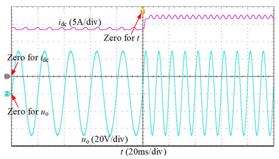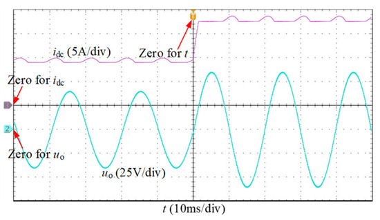The dynamic performance of the output voltage control strategy will be verified in this section. The frequency remains 50 Hz, and the amplitude of the reference voltage is adjusted from 40 V to 60 V. According to Formula (18), i dc * is set to 9 A and 17.5 A, respectively. The experimental waveforms of idc and uo are shown in Figure 14. idc reaches the steady state again after 2 ms and remains above 17.5 A. In Figure 14, the uo‘s amplitude is adjusted to 60 V with smooth changing.