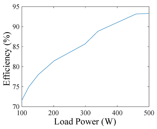 Finally, the CSI’s efficiency has been tested under different load powers from 100 W to 500 W. A curve map of the CSI’s efficiency is illustrated in Figure 16. When the load power increases, the power loss in the conduction and switching increases relatively more slowly than the load power, so the CSI’s efficiency rises with the increased load power.