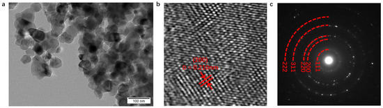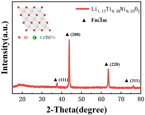 Figure 1 shows the XRD pattern of LTNO materials prepared by the sol–gel method, which is consistent with a report in the literature [31,32]. The diffraction peaks at 37.6°, 43.8°, 63.5°, and 76.3° can be attributed to the structure of the Fmm space group (PDF#74-2257), and no other peaks are observed. The XRD result indicates that a material with typical rock salt structure was successfully synthesized. The nanoparticle geometry demonstrates large surface area, which can improve the Li+ diffusion coefficient [33]. HRTEM and SEAD (Figure 2b,c) provide additional evidence for the structural characteristics of LTNO. HRTEM images display clear and continuous lattice fringes with a spacing of 0.21 nm, matching well with the (200) plane in the Fmm space group. The SAED pattern exhibits diffraction rings of LTNO, which can be accurately indexed to the cubic Fmm phase of the cation-disordered rock salt structure [34]. These results agree well with the XRD pattern in Figure 1. All these structural characterizations confirm that a Li1.17Ti0.58Ni0.25O2 DRX cathode is successfully synthesized. The structural diagram of LTNO is shown in Figure 1. Oxygen atoms are tightly packed in an O3-stacking manner to form a structural framework; all cations (Li, Ti, and Ni) are randomly distributed in the octahedral sites of the oxygen sub-lattice [31,34].