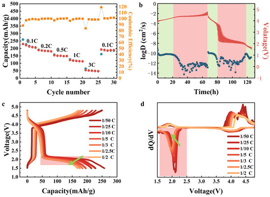 (a) Rate performance of LTNO. Blue, red and orange dots represent the charge capacity, discharge capacity and coulombic efficiency, respectively. (b) GITT measurement performed on the first cycle of LTNO, the GITT curve is represented by red curve and Li+ diffusion coefficient is represented by blue dots. (c) After activation at 0.1C, the charge–discharge curves of LTNO from 1/50C–1/2C and (d) corresponding dQ/dV profile. The redox intervals of O and Ni are represented by red shadow and green shadow. The arrows indicates that the discharge voltage moves to the low voltage.