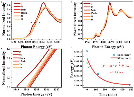 To validate the correlation between LMCT and ARR kinetics, here, the LTNO cathodes at a 4.8 V charged state are maintained at the moderate heating temperature of 100 °C with varying durations from 0 s to 8 h. XANES is then utilized to probe the valence state evolution of LTNO against heating duration. In Ni K-edge XANES, depicted in Figure 4a, a noticeable absorption edge shift to higher energy can be found from a pristine state to a 4.8 V charged (duration 0 s) state. Upon maintaining at 100 °C, Ni K-edge XANES demonstrates a gradual but obvious absorption edge shift to lower energy with increasing duration (enlarged edge shift in Figure 4c). These results indicate that nickel undergoes oxidation to a higher valence state (+3/+4) during charge but undergoes gradual Ni reduction upon relaxation. On the other hand, Ti K-edge XANES does not exhibit significant changes, suggesting that the valence state of titanium remains relatively stable throughout the charging process, as shown in Figure 4b. The absorption edge also remains nearly unchanged during heating, indicating the stable valence state of titanium. These results verify the LMCT behavior of the LTNO cathode, and the process only occurs from O to Ni while Ti remains unchanged. To further demonstrate the detailed LMCT procedure, the Ni K-edge absorption energy is plotted against duration time, as shown Figure 4d. The Ni K-edge absorption edge demonstrates a dramatic energy shift within the span of 0 s to 15 min, followed by a gradual energy shift within the span of 15 min to 500 min. Such a behavior can be well fitted within an exponential decay function according to Equation (2):