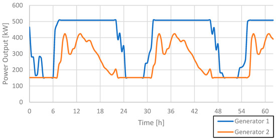 A representation of the current configuration of the UFS rural campus microgrid is illustrated in Figure 1. The actual time series data from the UFS rural campus microgrid [9] were used in determining the DG usage pattern to satisfy demand. A summary of the properties of the microgrid can be found in Table 1, and [9] was consulted for further background information. Using Hybrid Optimization of Multiple Energy Sources (HOMER) [10] as a simulation tool to determine the DG set usage pattern, a worst-case scenario, which is the longest period in the time series where the DG set operates above a minimum load of 30%, was identified (Figure 2). The worst-case scenario took place over a period of 62 h.