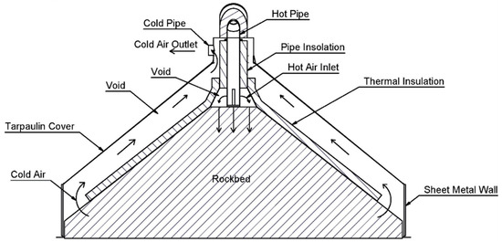 A suitable TES system needed to be identified that would be able to store the determined amount of thermal energy, while being an economically and practically viable solution for a rural microgrid. With air as the already available heat transfer fluid (HTF), TES systems that use air as HTF were considered, eliminating a heat transfer stage and thus an opportunity for heat loss. A rock bed TES system was found to be a suitable solution, using air as HTF and rocks as a storage medium. Rock bed TES systems have a capital cost of 14.09 USD/kWhth [14], compared to a molten salt TES system (22–30 USD/kWhth) [15]. Dolerite is a readily available rock type in South Africa and can be used as a storage medium for thermal energy [16]. Figure 3 illustrates a rock bed TES system developed by [14], which yielded a volumetric efficiency of 61% and an overall efficiency of 94.24% over three charge–store–discharge cycles.