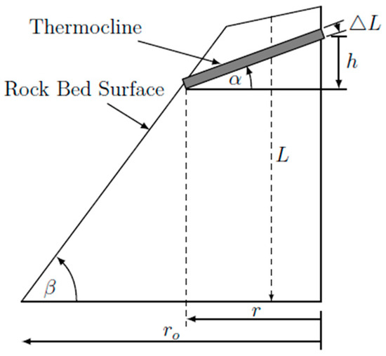 An analytical model was developed to evaluate the potential of storing thermal energy from waste heat. Based on a theory developed and verified [17], the analytical model represents a one-dimensional heat transfer plane. Using Figure 3 as reference, the rock bed has a conical shape, and through experimental campaigns [14], the progression of the heat transfer (thermocline) could be approximated, as illustrated in Figure 4. The thickness of the vertical progression is governed by the typical diameter of a dolerite rock. The shape of the thermocline is caused by the heat following the path of least resistance, which is situated between the rock bed and the thermal insulation material. The progression angle is represented by α, with L the rock bed height, ro the rock bed outer radius, ri the radius of the thermocline, h the thermocline height, ΔL the thermocline thickness and β the natural angle of the rock bed.