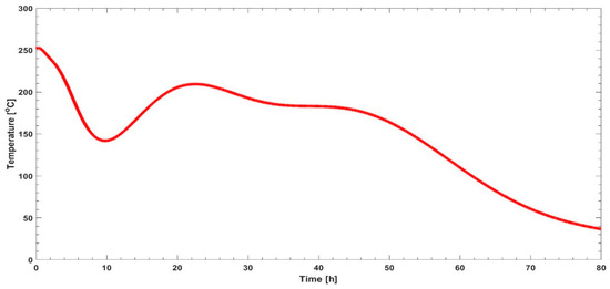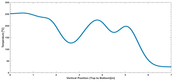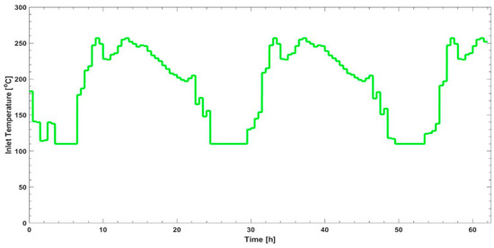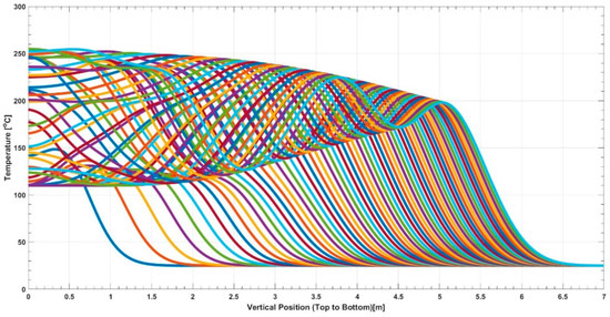 Figure 5 illustrates the hourly temperature distribution within the rock bed from hour 1 to hour 62 (each hour represented by a line) when taking a slice in the middle of the rock bed from top to bottom. Since the rock bed has a conical shape, it can be assumed that the temperature distribution is the same throughout the rock bed at each thermocline. An interesting observation can be made from Figure 5, which shows an oscillation starting at a high amplitude, decreasing through the rock bed, and tending towards a steady-state equilibrium. The inlet temperature to the rock bed, thus the temperature received from the waste heat of the DG set, can be observed in Figure 6. Figure 7 depicts the final temperature distribution after a 62 h charge cycle. An 80 h discharge cycle resulted in the outlet temperature profile illustrated in Figure 8.