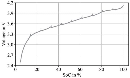 The parameters of a battery are highly intercorrelated. During operation, it is important to accurately monitor the condition of the cells to ensure efficient usage and adequate loading. In the process of developing an ML model, considerable attention must be paid to the selection of features, as the results are highly dependent on the input data. The data processing steps include data collection, data cleaning, and data transformation []. Real-world data were obtained by loading an LIB in a battery test system. The experiments were conducted using the Molicel 21700 P42a battery cell, which has a capacity of 4.2 Ah with an end-of-charge voltage of 4.2 V ± 0.05 and a cut-off voltage of 2.5 V. The battery was cycled in a temperature chamber at a constant temperature of 23 °C. The test system was an OctoStat5000 from Ivium Technologies. The cell was discharged in ten percent intervals from a SoC of 100% to a SoC of 0%. Every 0.5 s, the voltage, current, and temperature of the cell were measured. A discharge cycle of the analyzed battery cell is shown in Figure 1.