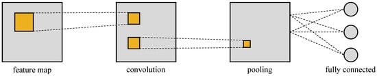 Structure of a CNN with a feature map followed by a convolution, a pooling layer, and a fully connected layer. The filter is moved across the features.