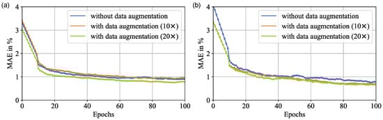 Convergence of the different models. MAE is shown over the epochs for the MLP (a) and the CNN (b) with and without augmented data.