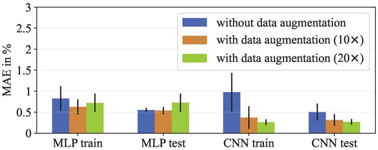 Error bars and standard deviation of the five times retrained models without data augmentation, with ten times the initial data and 20 times the initial data. The MAE is shown for the MLP and the CNN.