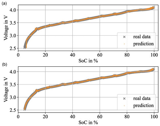 As stated before, the test data consist of only real data of a discharge cycle. Therefore, a direct comparison between real data and the prediction of the model can be drawn. For the MLP, this is shown in Figure 6a and for the CNN in Figure 6b. For a full discharge cycle, the voltage is shown over the SoC. The real experimental data are indicated in gray. The results of the final model with augmented data are demonstrated in orange.
