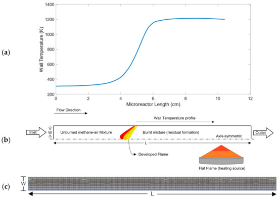 Recent developments in micro-manufacturing technologies have dramatically accelerated the versatility of micro-electromechanical systems (MEMS), unmanned aerial vehicles (UAV), and communication and sensing gadgets. All these devices necessitate compact, long-lasting, and instantly rechargeable power supplies capable of delivering power in the range of 10−3~102 W [1,2]. Motivated by the significantly higher chemical energy densities of hydrocarbons as compared to most advanced batteries, microscale combustion research has been actively pursued in an effort to maximize the operational lifespan of these devices [3,4]. To be specific, current cutting-edge batteries have an energy density of 0.05~0.265 kWh/kg, which is ~1/60th (for the upper energy density limit) of that of typical hydrocarbon fuel, such as methane (CH4) [1,5]. Many physical and chemical processes impact micro-combustion systems; topics such as gas-phase phenomena, surface reactions, species transport, and thermal properties of the combustor material, as well as thermal and mass diffusion, convection, and radiation can all have a dramatic impact on a specific application [1,5,6,7,8].