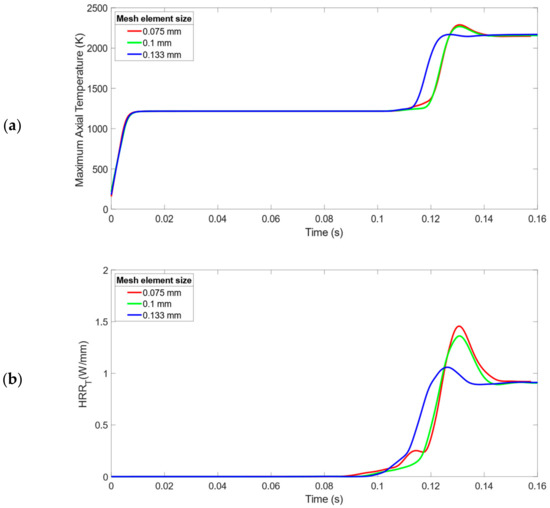The computational domain was segregated into evenly sized square mesh elements, with three different grid sizes employed, namely, 0.075 mm (fine), 0.1 mm (moderate), and 0.133 mm (coarse). To compare the performance of these meshes, the maximum axial temperature and the total heat release rate (HRRT) were monitored over a specific time, as shown in Figure 2. Here, HRRT was computed numerically by integrating the heat release rate for all the chemical reactions over the computational domain at each time step. When this property peaks, it indicates the ignition and then the formation of a flame front. As depicted in Figure 2, the temperature for the three cases was identical from the starting point of the heating process until the mixture moved into the ignition phase; however, variations in the peak temperature were observable thereafter, especially for the coarse mesh. Nevertheless, the other two cases (the moderate and fine meshes) agree well, with almost the same ignition times and maximum temperatures. In a similar way, the HRRT curves experienced a noticeable deviation upon varying the grid size. This is especially profound when approaching the ignition time, where the properties experience the highest gradients. The coarse mesh failed to predict the ignition time and the peak reaction rate, as well as the other two cases, whereas satisfactory agreement is seen between the moderate and fine meshes. It is noted that the HRRT data were quite noisy; therefore, smoothing it was necessary to avoid any misleading data representation. Because of that, slight deviations produced by such a process are inevitable, especially where high noisiness points were detected; however, the time at which the peak of HRRT occurred (indicating the ignition time, which is of significant importance in this comparison) was the same for both the 0.1 mm and 0.075 mm meshes. Recognizing the fact that the simulation time and required memory almost doubled as the mesh size was reduced from 0.1 to 0.075 mm, and accounting for the number of cases simulated in this work, the moderate mesh, 0.1 mm, was chosen for all the remaining simulation runs. It is noted that, in terms of the flame behavior, the simulation results are comparable with those found throughout the literature [19,29,33].