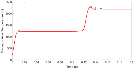 The maximum axial temperature vs. time for an inlet velocity of 0.4 m/s, a channel width of 2.3 mm, and a stoichiometric fuel/air mixture. The markers represent the specific time steps for further clarification in Figure 4.