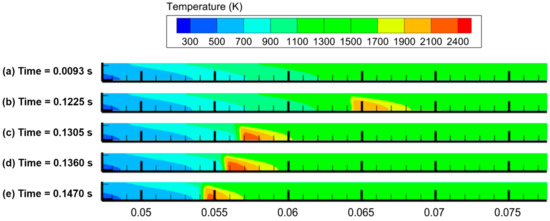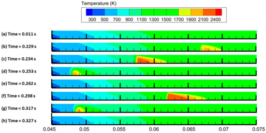 In the event of FREI, the flame could not sustain itself due to unrestrained heat loss through the microreactor wall; however, after the flame extinguished, the supply of the fresh fuel–air mixture eventually reached the high-temperature zone downstream of the channel and ignited again. Such phenomenon is detected numerically and experimentally in the literature [27,28,29,34]. To better comprehend the FREI phenomena, a specific case with an inlet velocity of 0.2 m/s is presented in this section. Specifically, Figure 9 shows variations of the maximum axial temperature during the combustion process, while Figure 10 presents the spatial temperature contours corresponding to the selective time steps in Figure 9. The ignition process was exactly the same as that for the stable flame; however, in a FREI mode, as the flame front formed and propagated upstream, it started to diminish after point (d) until flame extinction occurred just before point (e). Due to the uninterrupted fuel–air feeding source, the mixture ignited again, and the process occurred repeatedly, as clarified in the rest of the points; see positions (f)–(h) in Figure 9 and Figure 10.