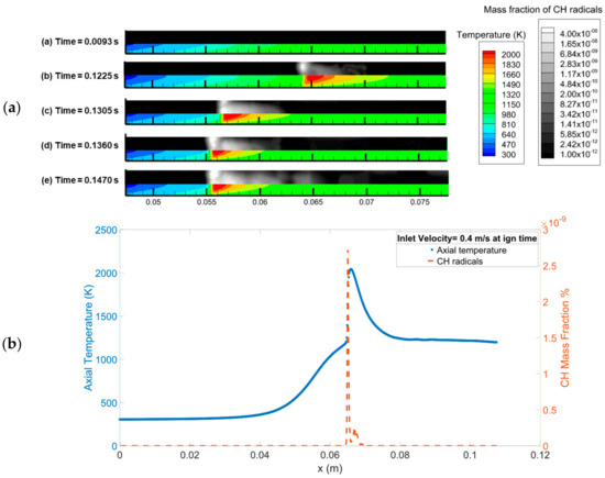 Moreover, to verify the reliability and functionality of the axial temperature metric, as well as its sufficiency to predict the ignition properties, the mass fraction of the CH radicals was monitored along with the axial temperature at the same points that have been defined earlier in Figure 3. Figure 7a shows both the axial temperature and the CH mass fraction at the time of ignition for an inlet velocity of 0.4 m/s; here, it is important to note that the location of the flame on the contour plots is clearly correlated to the formation of CH radicals. The highest CH concentrations were located at the upstream flame side, where the reaction occurred at the unburned fuel/air mixture region. In addition, as shown in Figure 7b, the maximum temperature gradient coincided with the location of highest concentration of the CH radical, which indicates the ignition location. These results demonstrate that the axial temperature data can provide the required accuracy to describe the ignition phenomena herein.